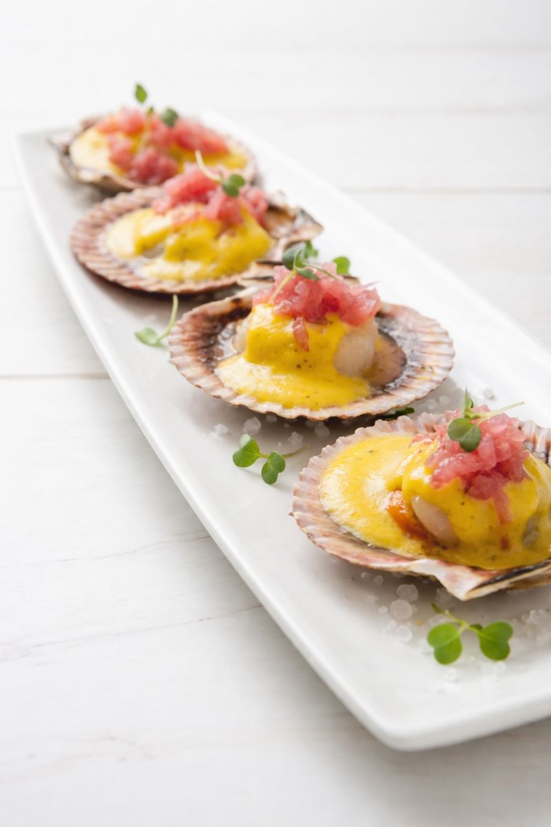 Cinq pétoncles crus marinés aux agrumes, vinaigre de framboise, yuzu et échalotes.