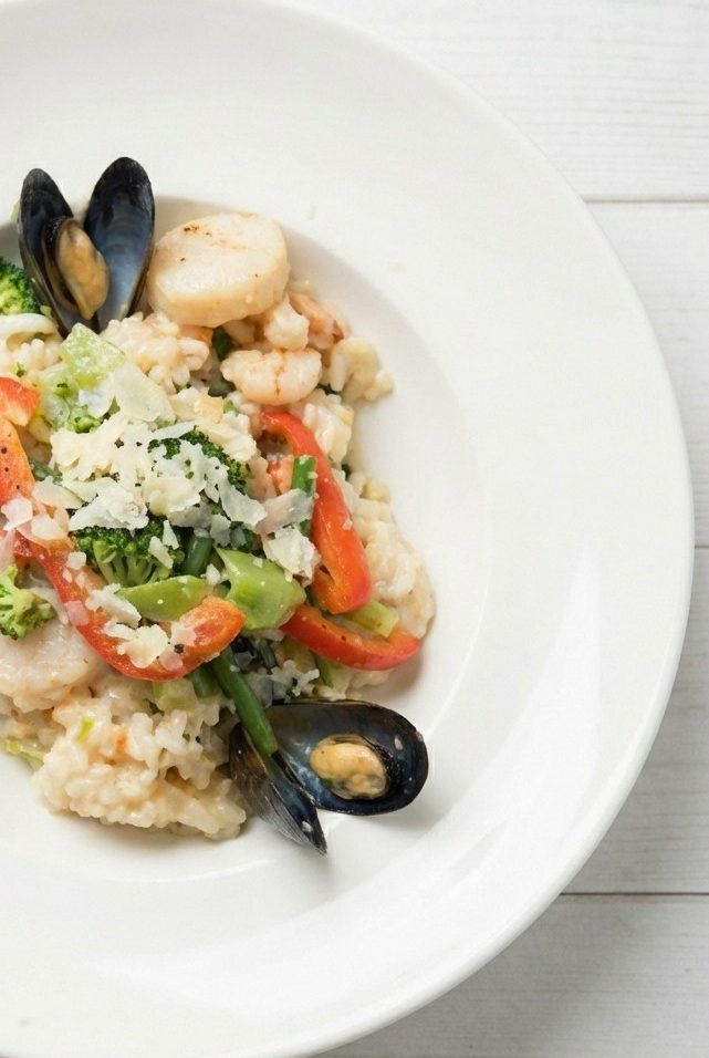 Risotto crémeux, pétoncles, moules, crevettes et parmesan.